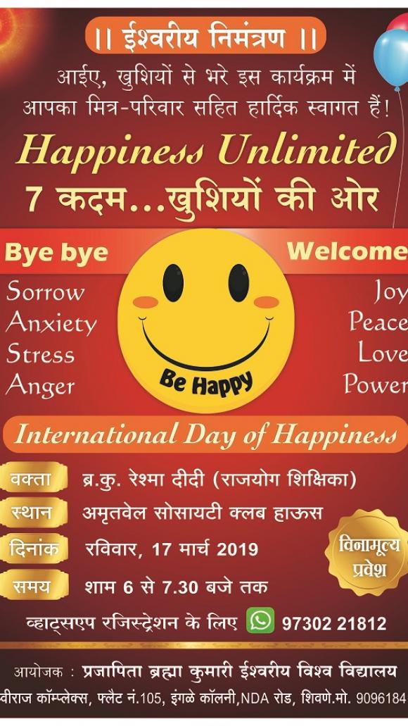 « All Events This event has passed. रिट्रीट – 7 कदम खुशियों की ओर (Happiness Unlimited) 17 मार्च 2019 Sunday, 17 March, 2019 @ 6:00 PM - 7:30 PM « 3 दिवसीय रिट्रीट : खुशनुमा एवं स्वस्थ जीवन जीने की कला (23 से 25 मार्च 2019) + Google Calendar+ iCal Export Details Date: Sunday, 17 March, 2019 Time: 6:00 PM - 7:30 PM